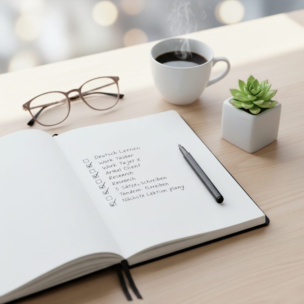 ここまで、発音・文法・フレーズ・独学ロードマップ・教材やアプリ・試験・生活フレーズ・地域差・継続のコツまでドイツ語学習に必要なことを一通り見てきましたが、どれも完璧にやろうとするとしんどいけど「まずはあいさつを覚える」「今日はアプリを5分だけやる」みたいに小さく始めれば、気づいたら続けられている自分に驚くはず。