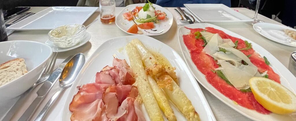 別の日に、別のレストランで白アスパラガスとベーコンの料理を食べました。こちらは定番のドイツ式で、茹でた白アスパラガスにベーコンとオランデーズソースがかかっていました。