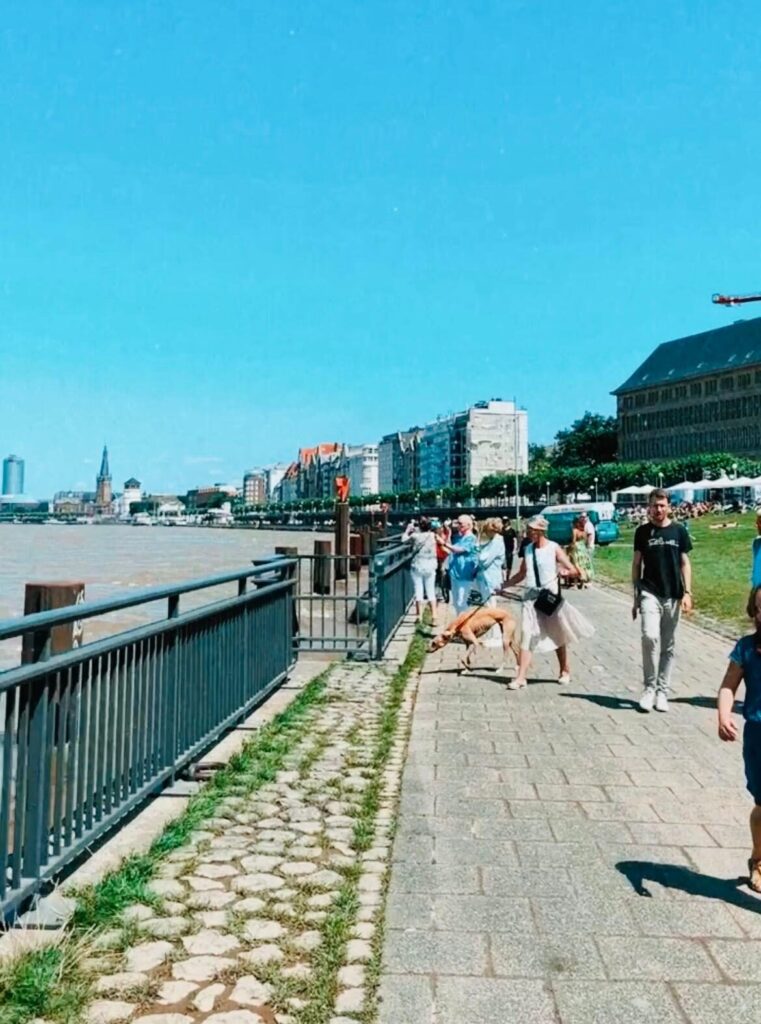 デュッセルドルフでは、ライン川沿いでピクニックをした2日前に大雨が降り、川が増水していました。当日は晴れていましたが、川の水量が多く、普段より濁っていたのが印象的でした。