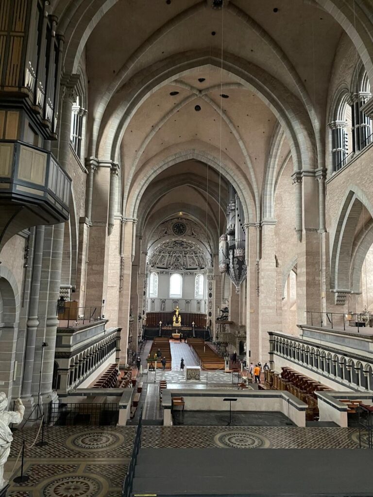 大聖堂の内部は、高い天井と重厚な石柱が荘厳な雰囲気を作り出しています。ステンドグラスから差し込む光が美しく、観光客だけでなく、地元の人もお祈りに来ています。
