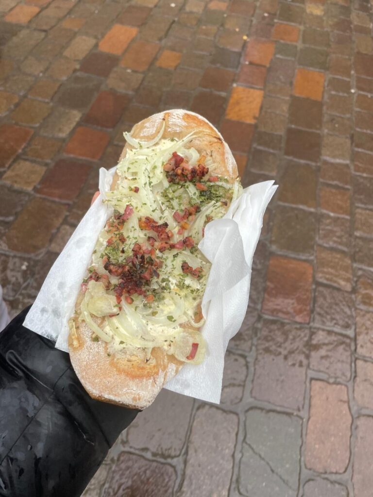 クリスマスマーケットで人気なのは、窯焼きのフラムクーヘン。フラムクーヘンは、薄いピザ生地にサワークリーム、玉ねぎ、ベーコンを乗せて焼いたアルザス地方の料理です。