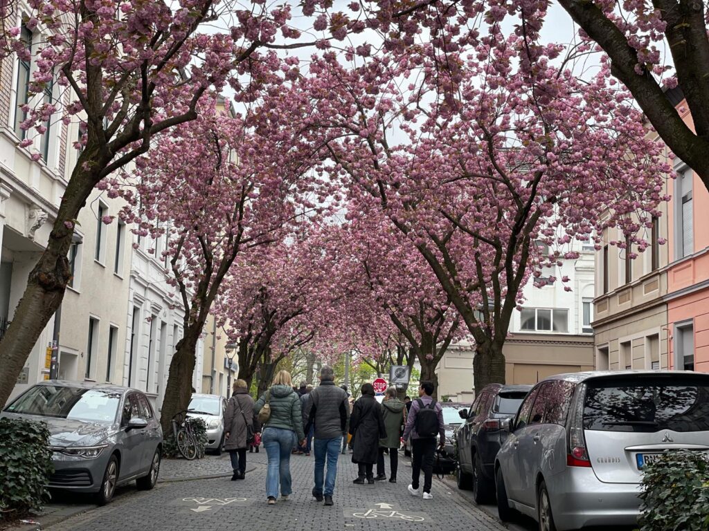 デュッセルドルフから約2週間後の2023年4月16日、今度はボンの桜並木を訪れました。こちらは打って変わって、たくさんの人で賑わう有名スポットでした。