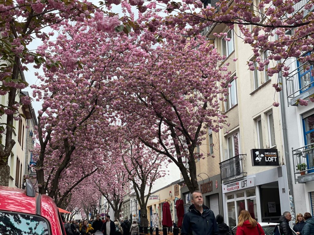 ボンを訪れたのは日曜日でした。これが混雑の大きな理由だったと思います。Heerstraße(ヘア通り)とBreite Straße(ブライテ通り)は、まるで桜のトンネルのように濃いピンク色の八重桜が咲き誇っていました。