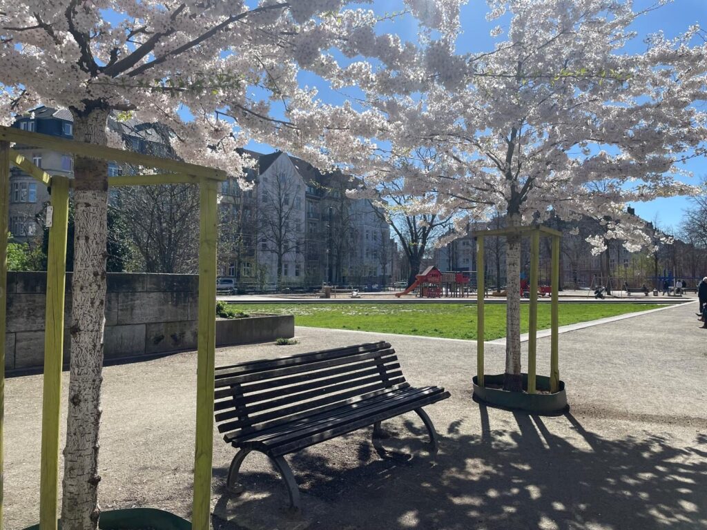 デュッセルドルフで桜を見たのは「Spielplatz Fürstenplatz(フュルステンプラッツ遊び場)」という場所です。2023年4月3日の晴天の日に訪れました。