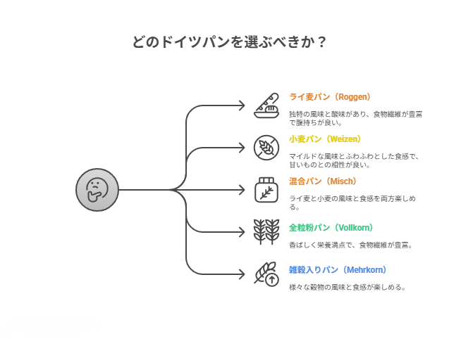 酸味が控えめなパンが好みなら、「ミッシュブロート(Mischbrot)」や「ヴァイツェンミッシュ」などを選ぶと食べやすいです。逆に、ライ麦の香ばしさや酸味をしっかり感じたい人は「ロッゲンブロート(Roggenbrot)」をチョイスしてみてくださいね。